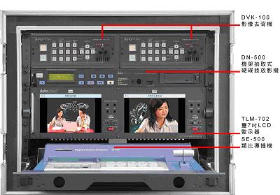 集成配備包括:2臺 DVK-100 影像去背機、SE-500 導播機、抽取式硬盤錄像機、2臺 CP-100 DVD播放器以及 TLM-702 雙7吋液晶監(jiān)視器