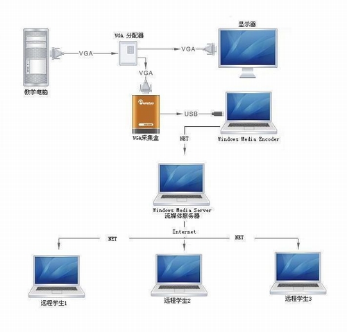 同步教學也就是實時教學,其實現過程如下:實時教學時,先把教師機(教師機需裝有麥克用來錄老師的聲音)的顯卡輸出給VGA分配器,再由VGA分配器分別輸出給顯示器和VGA采集盒(建議使用Epiphan的,本人使用過效果不錯),采集盒需通過USB接到已安裝Windows Media Encoder的電腦。那老師的聲音怎么錄呢?教師機不是已經接過麥克了嘛,我們把教師機的聲卡輸出接到已安裝Windows Media Encoder的電腦聲卡輸入。這樣安裝了Windows Media Encoder的電腦分別通過VGA采集盒和本身的聲卡來錄制教師的電腦屏幕和老師說的話了。通過Windows Media Encoder把老師講課的內容實時錄制成ASF流,并發布到流媒體服務器(就是安裝有Windows Media Server的電腦)。然后流媒體服務器啟動station Service服務模塊,通過多播發布ASF流,這樣遠程的學生用Windows Media Player就可以直接接收和播放ASF流了(學生自然就可以看到老師講課的內容了)。