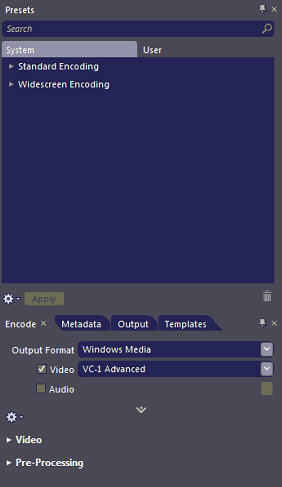 在Presets預(yù)設(shè)中選擇Encoder編碼選項卡,選擇指定輸出格式和視頻編碼器