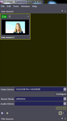 Epiphan幀采集器的吸引力是兼容大多數(shù)DirectShow應(yīng)用程序用于增強、編碼和提供實時視頻內(nèi)容。這些視頻軟件識別幀采集器為高分辨率攝像機(jī)。在這個例子中我們使用Microsoft Expression Encoder捕捉和記錄VGA2USB Pro視頻。