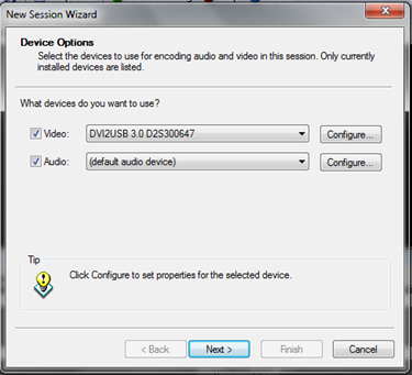 從“Video”視頻下拉列表中選擇DVI2USB,VGA2USB,DVI2PCIe或VGA2Ethernet幀采集設備。如果抓幀器沒有出現(xiàn)在列表中,檢查你的連接,并確保正確安裝了更新的驅(qū)動程序。使用Epiphan Capture Tool采集工具檢測以確保設備被識別。