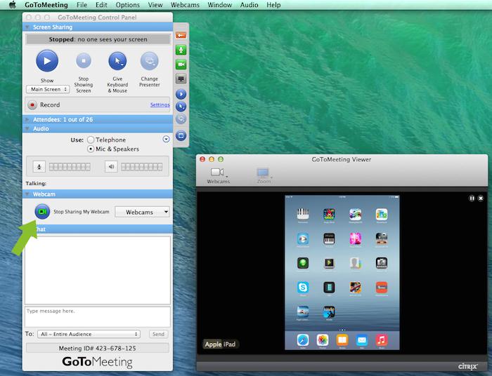 GoToMeeting的高級(jí)版使用戶能夠在同一時(shí)間分享他們的攝像頭和桌面屏幕。使用一個(gè)Epiphan幀或視頻捕獲器,您可以共享一個(gè)iPad屏幕像一個(gè)攝像頭或是“桌面”。