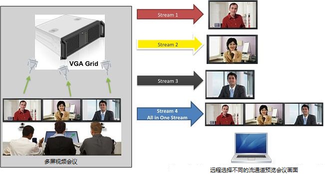 在視頻會議系統輸出遠程參與者到個人視頻屏幕, 建議用Epiphan  VGA Grid。VGA Grid可以編碼每個視頻顯示然后流到一個或多個輸出通道。系統還可以把所有的流或一些流到不同的視圖供遠程查看,只需為每個視圖訪問不同的url。