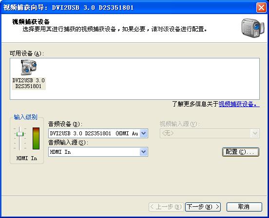 3.    打開視頻捕獲向導,選擇可用設備為“DVI2USB 3.0”,音頻設備選擇“DVI2USB 3.0 D2S…”, 音源輸入源選擇“HDMI In”,并將左側的音頻輸入級別調到想要的位置。