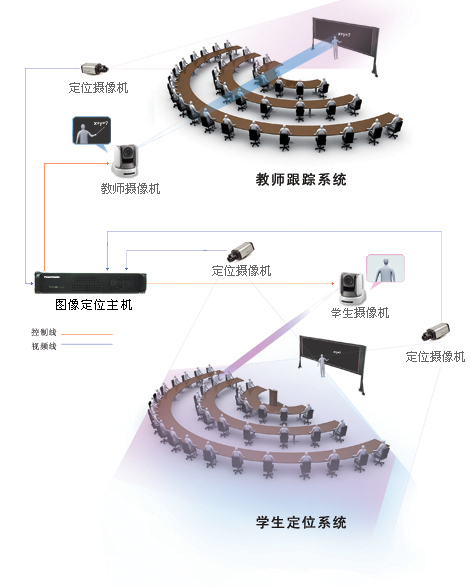 PowerCreator Graphic Position System 由兩個(gè)子系統(tǒng)組成:教師跟蹤系統(tǒng)與學(xué)生定位系統(tǒng)。教師跟蹤系統(tǒng)自動(dòng)計(jì)算教師在講臺(tái)上的位置,通知教師攝像機(jī)進(jìn)行轉(zhuǎn)動(dòng);學(xué)生定位系統(tǒng)自動(dòng)識(shí)別站立學(xué)生所處的位置,通知學(xué)生攝像機(jī)進(jìn)行定位,以特寫(xiě)的方式進(jìn)行拍攝。