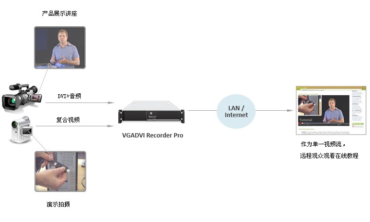 使用VGADVI Recorder Pro,你可以創(chuàng)建你的最終產(chǎn)品。 該解決方案使你能夠同時(shí)從多個(gè)音視頻源錄制音頻和視頻。 用戶使用此設(shè)備可將多個(gè)視頻和音頻合并成一個(gè)AVI格式的視頻。這對(duì)創(chuàng)建培訓(xùn)視頻來說是非常重要的。