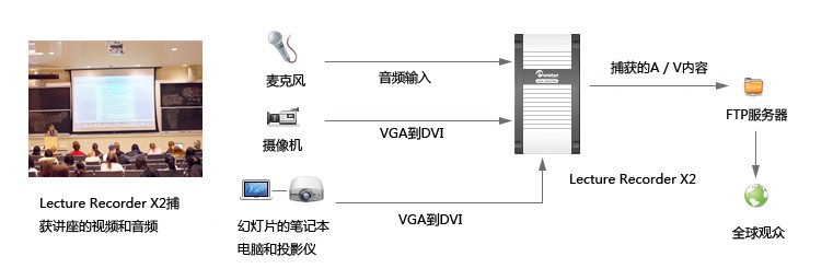 眾所周知,講座錄制和演示錄制對于傳統授課是較為重要的補充,這種方法為遠程學習提供了機會,可在演講現場進行大量信息交換。所記錄的內容可以被加工成不同的流媒體下載格式。以前,一個演講錄制小組需要錄制現場演講幻燈片和其他視頻內容時,他們要尋找一種非侵入性的解決方案,該方案應該能夠記錄任何來源的視頻和音頻,并提供快速處理過程。Lecture Recoder X2解決了這些問題。該設備捕捉到從個人計算機的PowerPoint幻燈片或從相機拍攝視頻無損輸出。將麥克風連接到設備的音頻輸入端口。整個過程通過Web界面管理,或是進行遠程管理。拍攝的內容可被上傳至FTP服務器,供世界各地的觀眾分享。