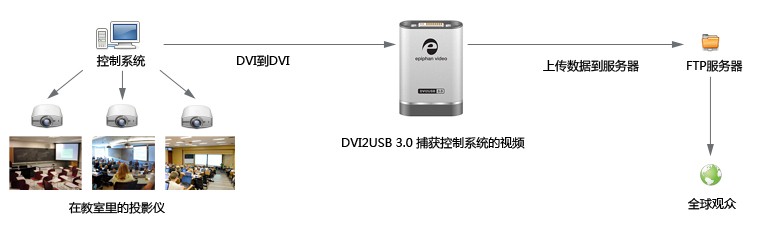 一所大學在學習過程中,安裝了面向未來的AV設備,以幫助學習環境內學生和教師的溝通。它包括控制系統、視頻會議室、多媒體室、投影系統和觸摸屏。視頻會議設備使分散的設施之間得以交互信息。另外,它們也可通過多種工具開展Power Point演示互動。鑒于播客對于大學講座傳播以及學生知識更新很重要,因此大學網站上應該有與播客同作用的演示文稿。大學工作人員便希望演示文稿以快速記錄高品質的視頻流并上傳至網絡。攔截從控制系統傳送至課堂投影儀的輸出,并將其傳送到播客設備,這個過程很必要。DVI2USB 3.0連接到控制系統的輸出,可將拍攝視頻內容發送到各種視頻服務器中。DVI2USB 3.0是一個易于使用和安裝的解決方案,能夠實現全民教育的目標。