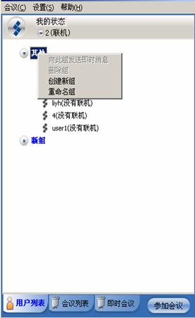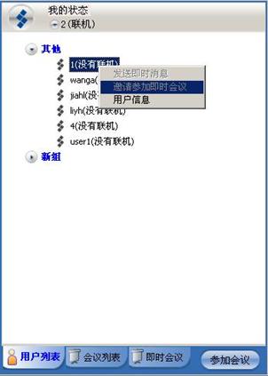 當用戶需要召開一個即時會議時,可以直接通過右鍵菜單將其他人員邀請至即時會議室,受邀人員不需要任何驗證即可進入會議室,并且受邀人員可以邀請其他人員進入該及時會議中。并可通過 察看目前召開的即時會議信息與參與人數等信息。