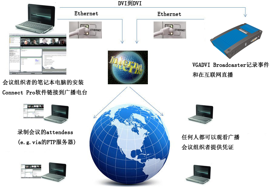 這個計算機硬件的解決方法,是將你正用于在線使用并安裝了Connect Pro電腦的DVI信號和音頻端口連接起來。它將音視頻從會議中以數據形式輸出并儲存,接著把這些數據在互聯網上廣播。無論這個人是否參加到會議中或是否安裝了Connect Pro,都可以通過聯網的計算機遠程收看廣播。這幫助他們擴大了觀眾數量。你可用Content Delivery Network(CDN)的服務增設更多的連接。